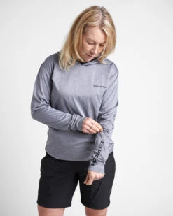 Long sleeved lightweight, quick drying hooded t-shirt with UVF50+ protection. Perfect multi-sports T-shirt, where hood and button at neck combined with the extended arm length and thumb loops add extra protection from the strong UV rays to help you stay protected. Versatile top – great for summer days on the water and as a training t-shirt.Â