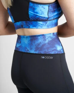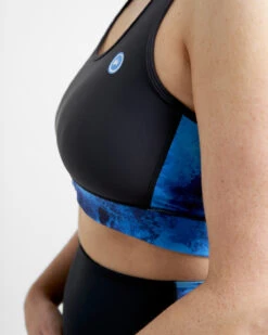 Medium Impact Sports Bra/Bikini top in signature Rooster Azure Womens styling. Double layered throughout for added support and a racer back made from mesh enhances breathability. Wide yet soft elastic chest band keeps top securely in place.