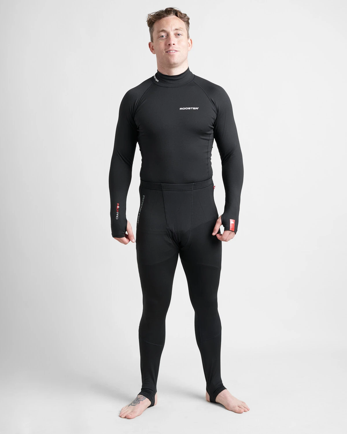 Rooster Polypro™ is constructed from a combination of Polypropylene (94%) and Elastane (6%). We’ve brushed the inner fabric surface to give it a thick, fleece-like, high quality texture which feels incredibly warm and soft next to your skin. The resulting garments provides excellent thermal qualities making it the perfect base layer. Polypropylene is naturally hydrophobic, which means the fabric feels remarkably dry, even when wet. Wear it next to your skin underneath our neoprene Longjohns and Tops – in fact the possibilities are endless – our Polypro™ base layers would be great under your ski suit, drysuit, winter cycling, kayaking, walking and anytime you need a thermal base layer..