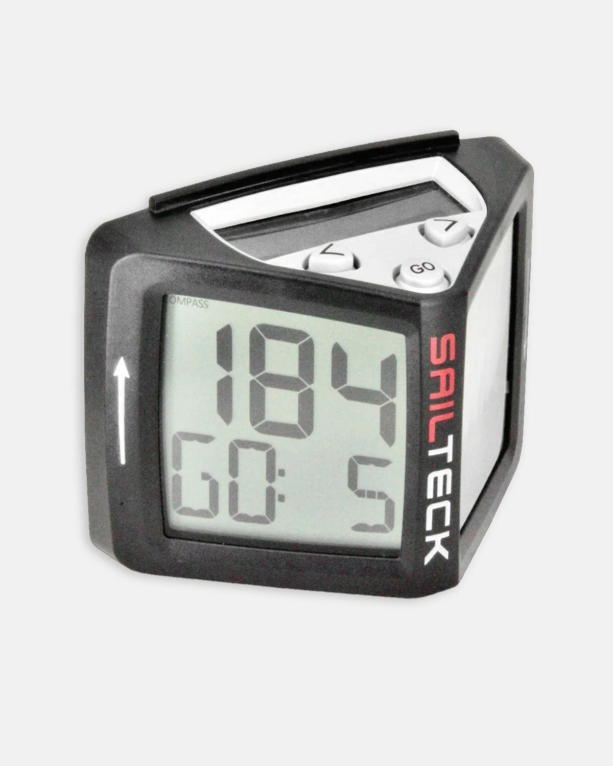 ILCA Rule 22 approved SailTeck SK01 compass. This new compass features a two line display. The upper line of large digits can show either heading or tactical modes. The lower line is normally used for the countdown timer, which after it has reached zero, can show elapsed time since the start, tactical, heading, time of day or blank, depending on you you have configured the compass