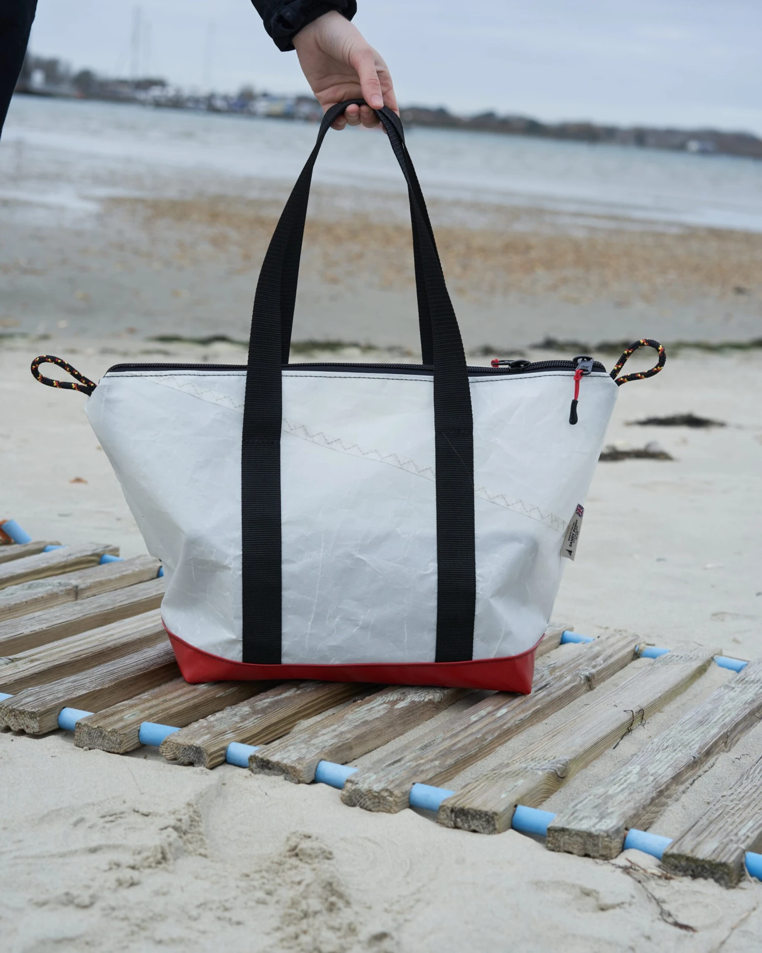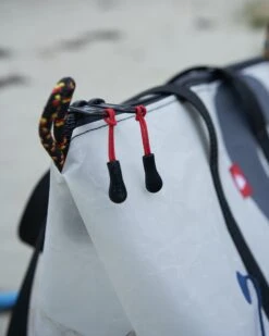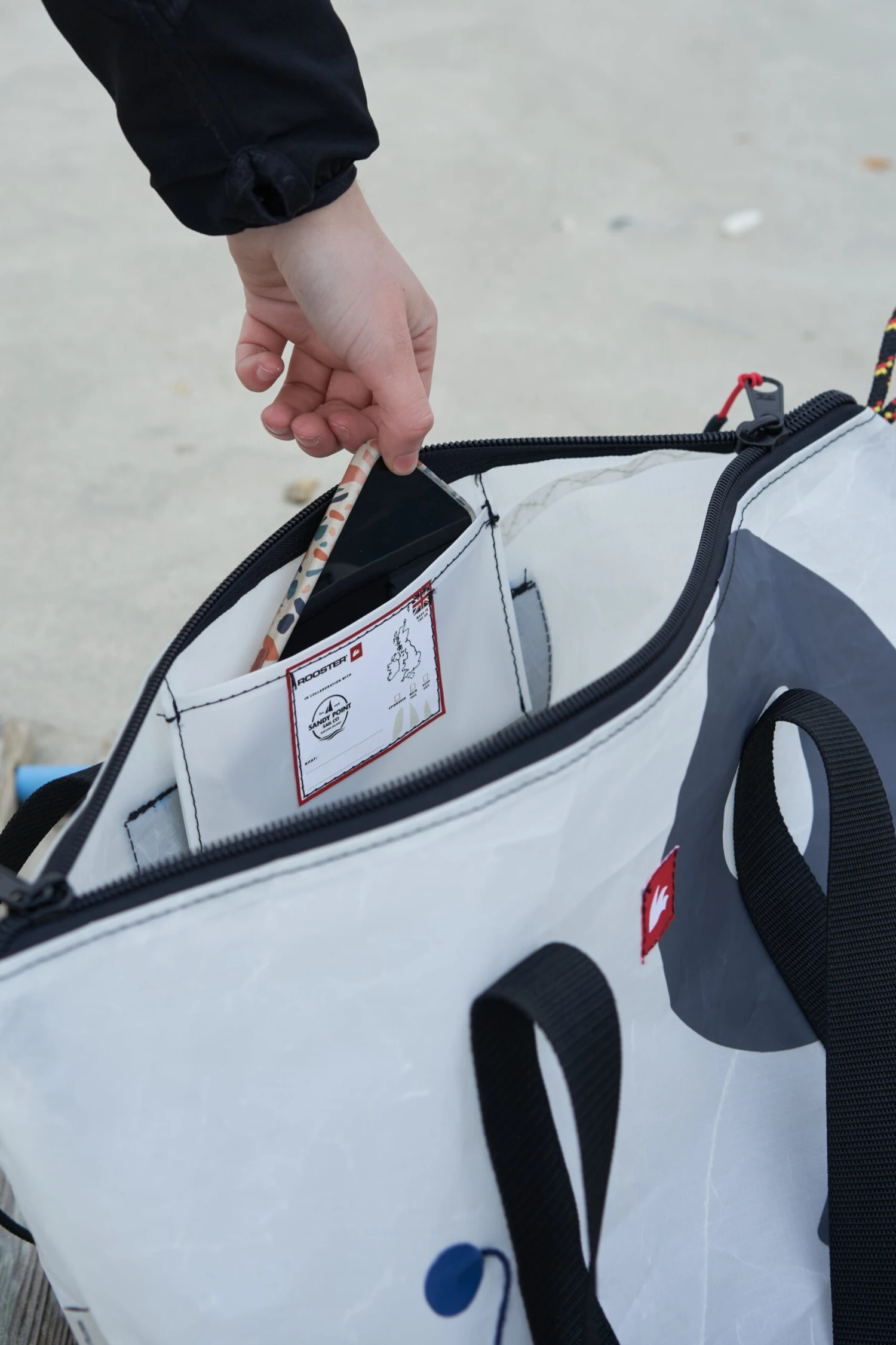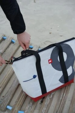 Each piece is meticulously crafted and completely unique, due to the nature of the upcycled sails. We have included a label on the inside where you can find out what sail your bag has been made from.